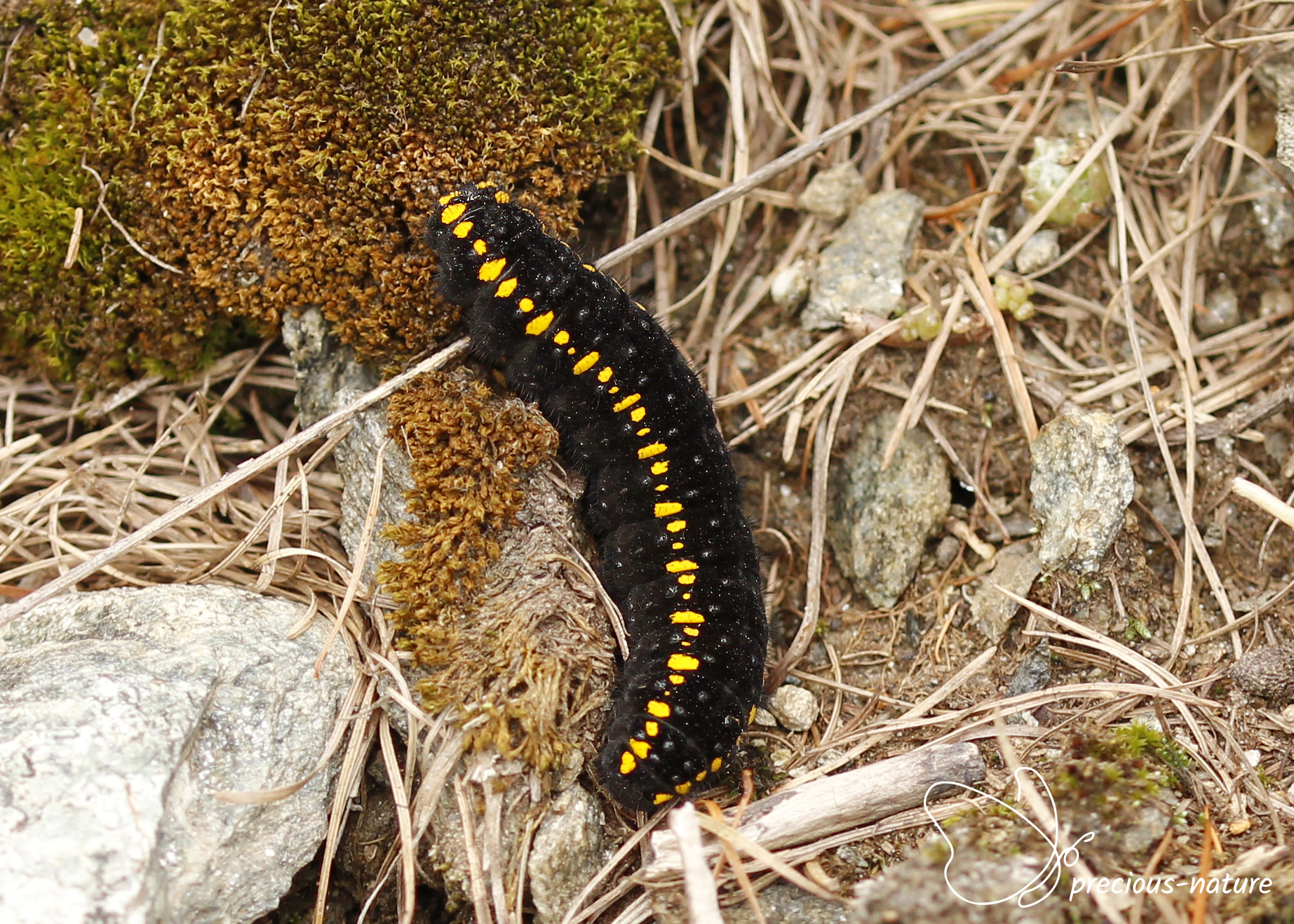 On my previous trip to the Swiss Alps, I had already seen the Apollo (Parnassius apollo) flying in the distance, but I couldn’t photograph it. It remained just the caterpillar. During my trip to the Maritime Alps, I finally could photograph it. This large white butterfly has three large spots along the leading edge of its forewing and one large spot halfway along the inner edge in cell 1b. Compared to the Small Apollo (Parnassius phoebus), the red spot along the leading edge is missing. On the hindwing, there are two black-bordered red spots with a white centre. A broad black-grey band runs along the inner edge from the base of the wing to halfway down the wing. The flight period is one generation from early May to September, and the wingspan is 60-90 mm. Host plant: White-wort, Orchard, Golden Root. Dutch name: Apollovlinder. Frisian name: Apolloflinter.