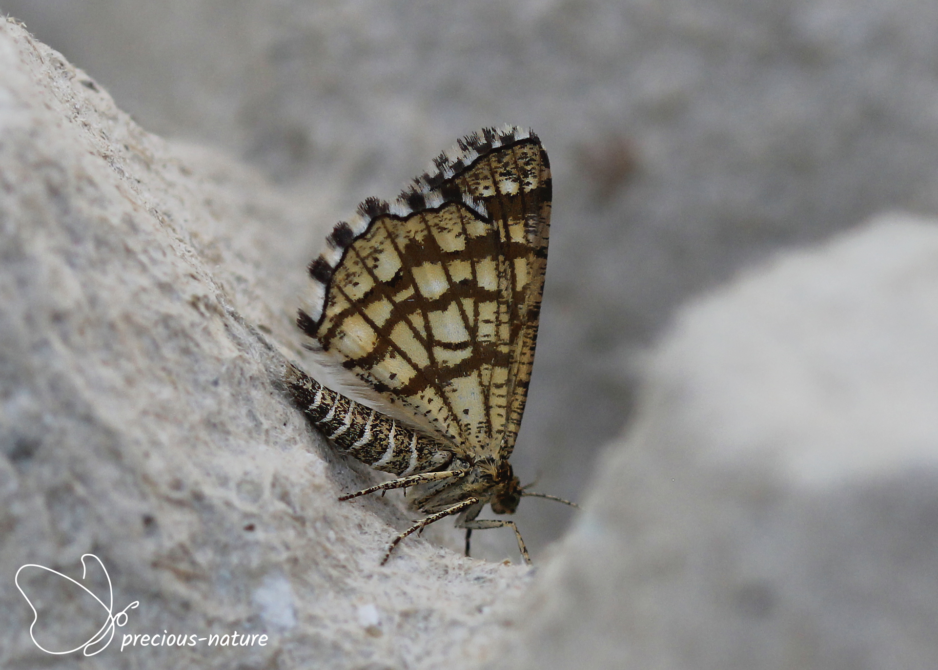 Het gebeurt mij niet vaak dat ik een vlinder ontdek waarvan geen Nederlandse en/of Engelse naam bekend is. Vandaar dat ik voorlopig de gespotte vlinder als geelbandspanner (Psodos quadrifaria) duid. De soort komt in de hogere gedeeltes van de Alpen voor en valt als dagactieve nachtvlinder goed op. Op de donkerbruine voor- en achtervleugel is een grote donkergele vlek in het postdiscale deel te zien. In rusthouding spreidt hij zijn vleugels. De vliegperiode is één generatie van mei tot in augustus en de spanwijdte bedraagt 18-25 mm. Waardplant: paardenhoefklaver. Engelse benaming: Yellow-bordered Beauty. Friese benaming: –